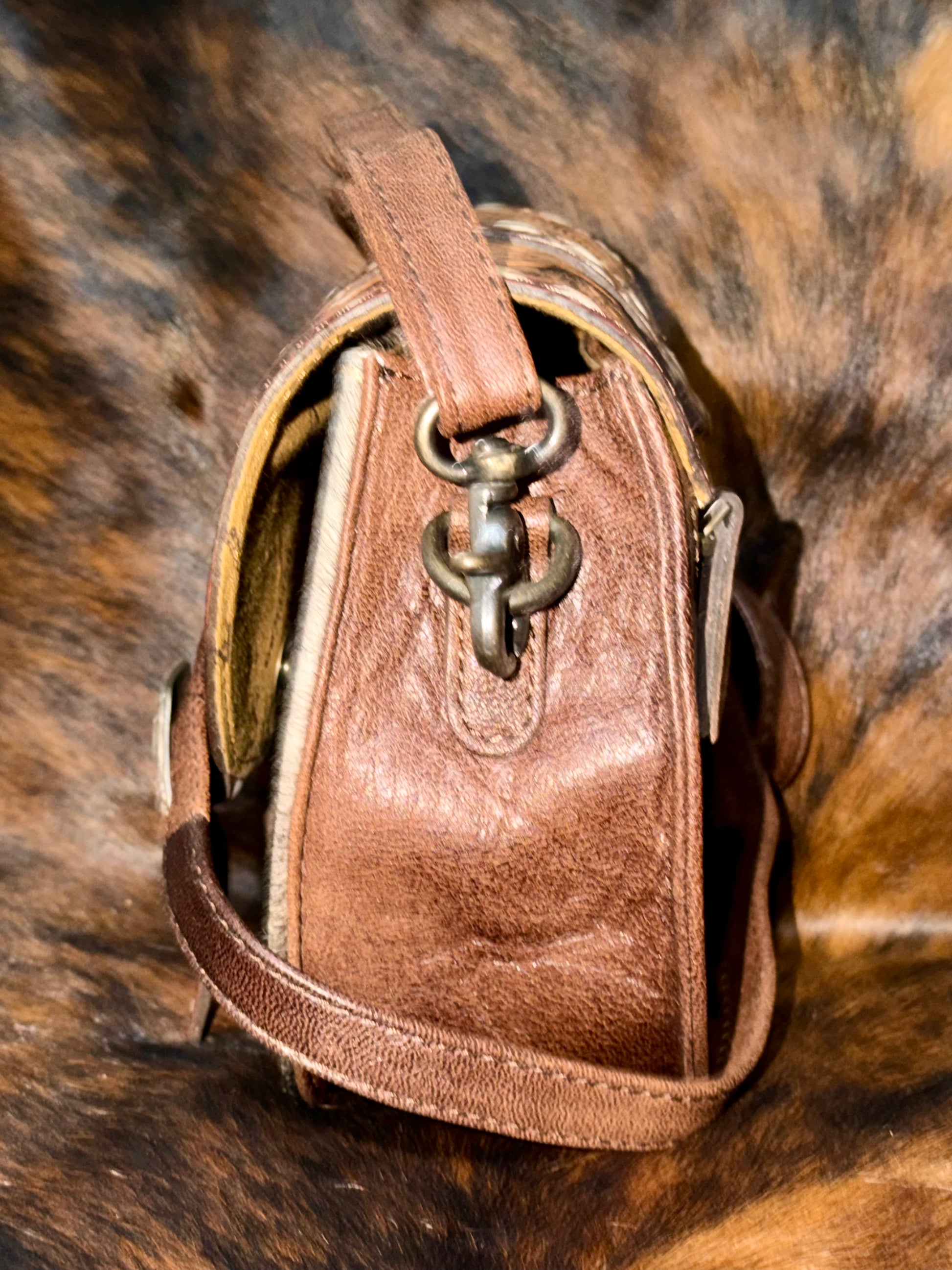 Expertly designed in Texas, this compact crossbody reflects traditional Western heritage through its handcrafted details, reinforced edges, and natural cowhide texture. Sized at 7in (H) X 8in (W) X 3in (D), it securely holds your essentials without bulk. For care, gently brush the hair-on cowhide with the grain and condition the leather occasionally to preserve the tooling and natural finish.