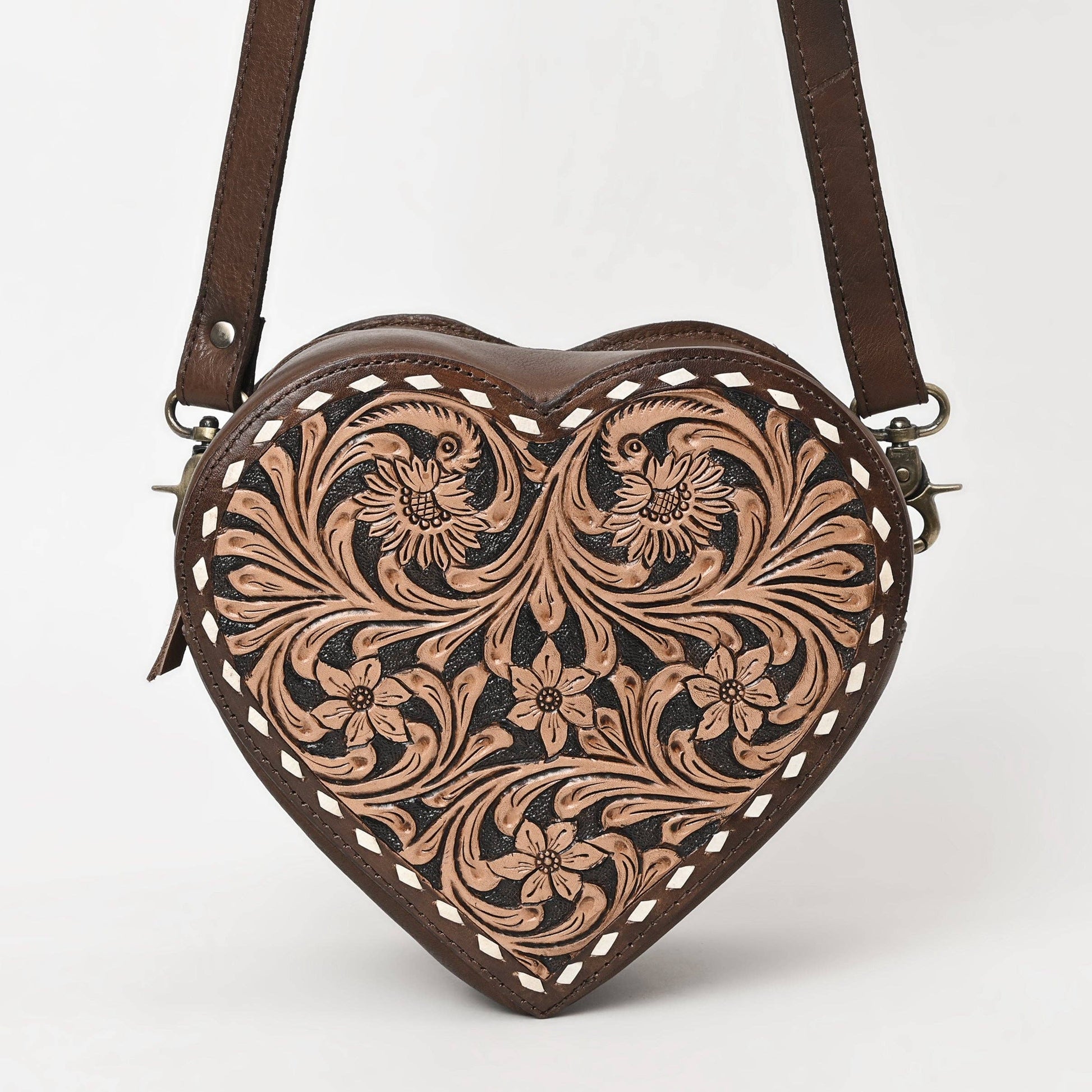 * Tooling: Intricate hand-tooled floral pattern with whipstitch accents